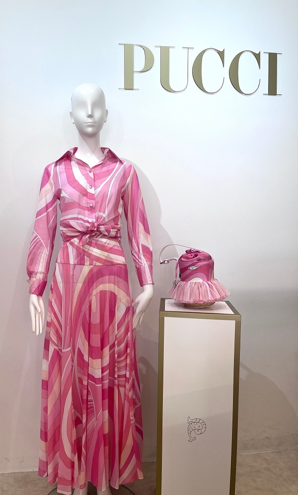 本日ご紹介するコーディネートは、目を惹くピンクのグラフィカルプリントが印象的な、Pucci らしさ溢れるスタイル🩷