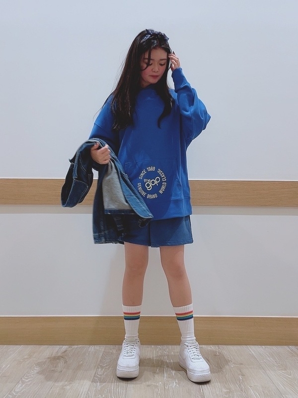 【新作】鮮やかなブルーのセットアップコーデ♪ 2022.02.01 バックプリントが映える新作スエットを使ったコーデ♪ カラーは3色展開で、今回は1番発色の良いブルーをメンズのショートパンツで合わせました! ヘアバンドを合わせることでボーイッシュになり過ぎず可愛いさもmixさせて♪