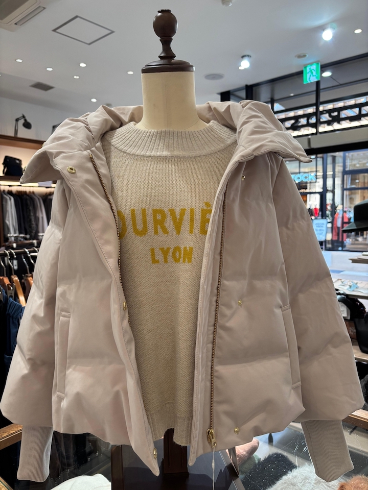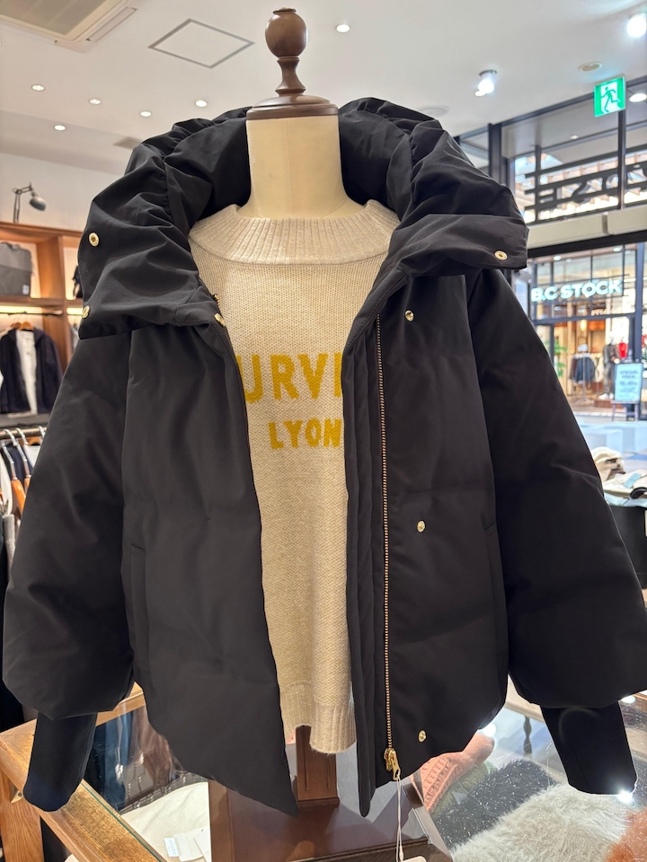 顔周りが華やぐボリューム襟と、袖口リブがポイントのダウンジャケット。