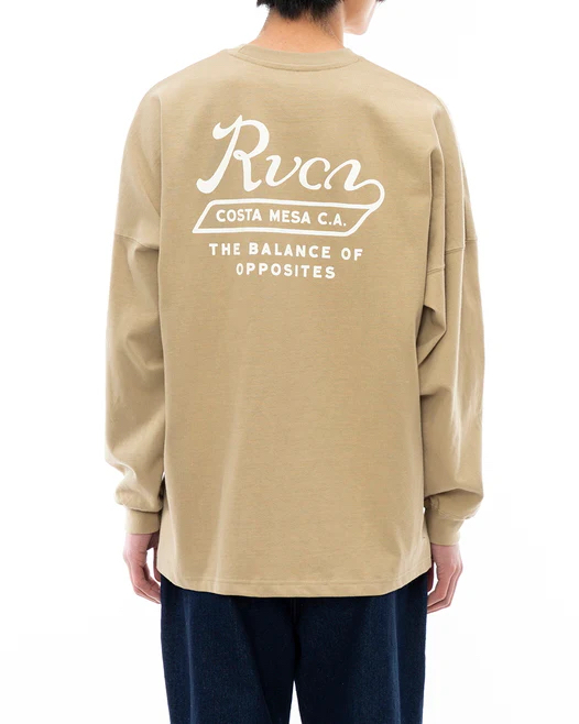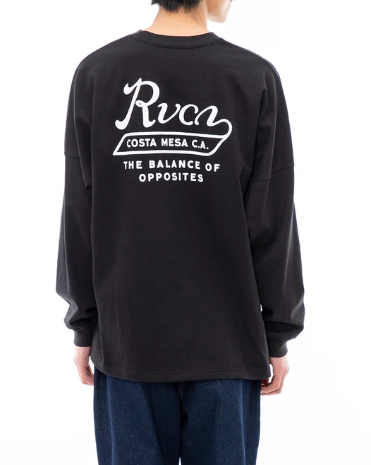 左胸と背面に、RVCAのスクリプトロゴとステートメント「BALANCE OF OPPOSITES」を組み合わせたロゴが