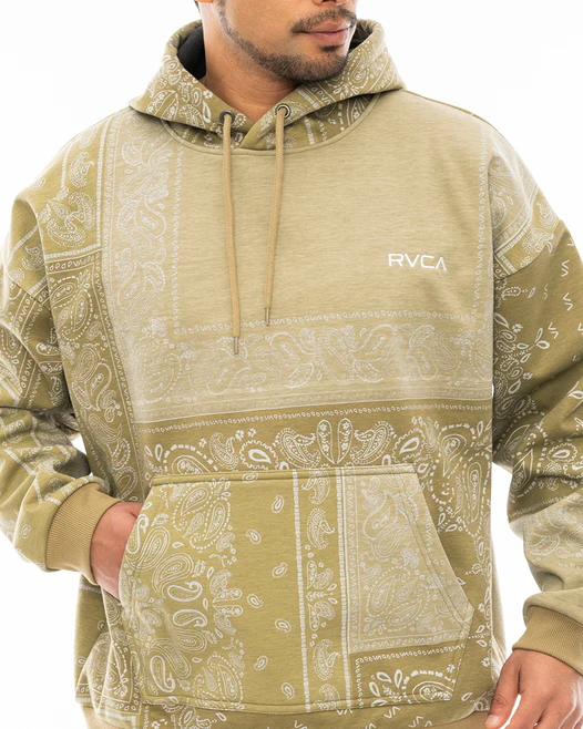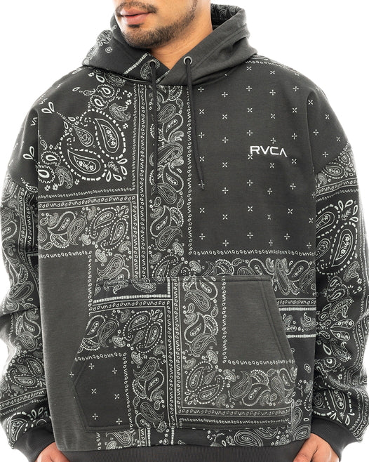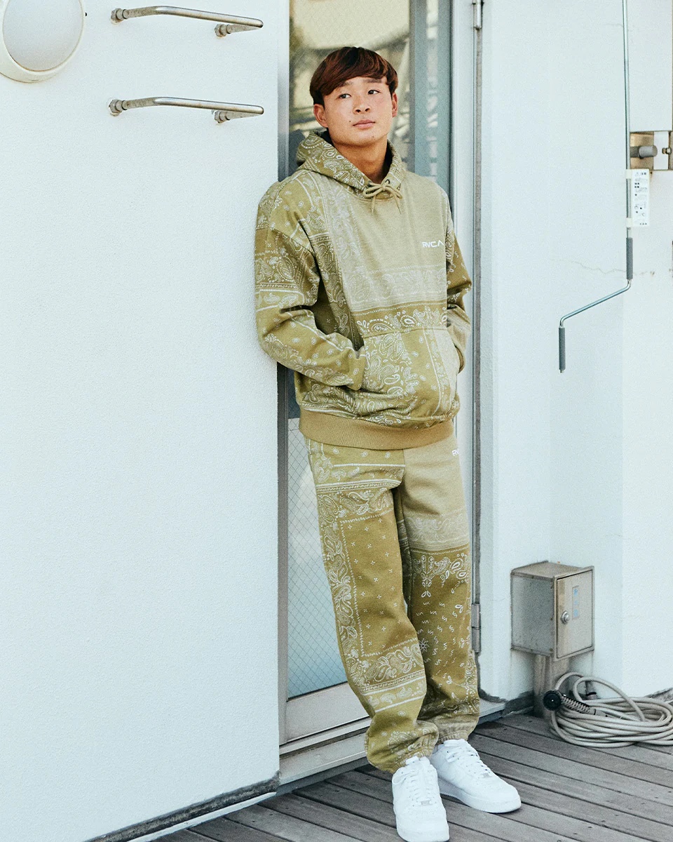 トーンの異なるバンダナ柄を組み合わせ、パッチワークデザインで仕上げたプルオーバーフーディーとパンツ。